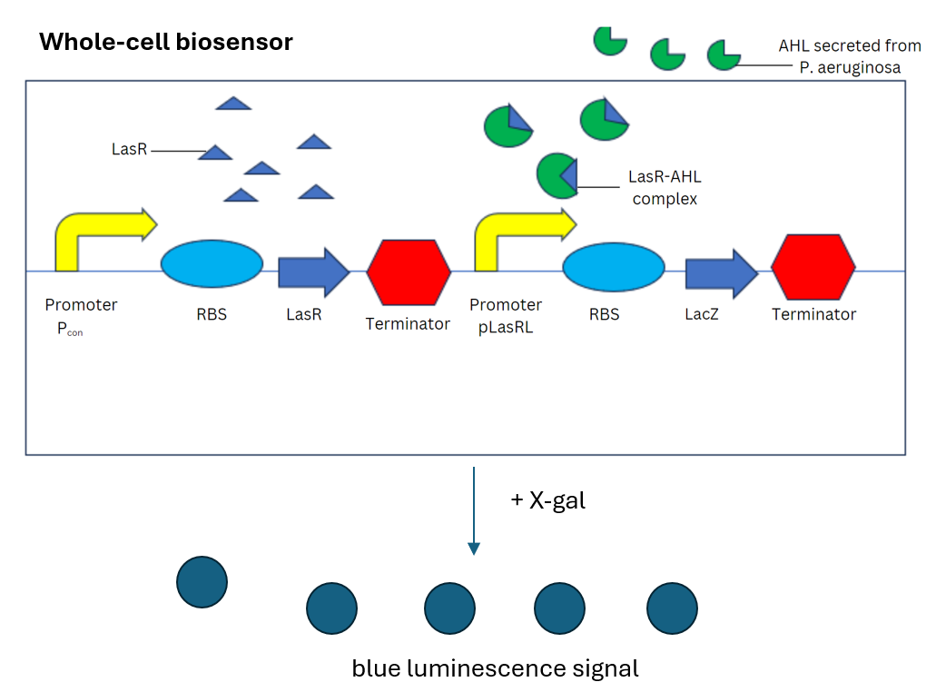 Pseudomonas aeruginosa (or P. aeruginosa), is a type of gram-negative bacterium which contains a quorum sensing system LuxI/LuxR circuit. The Luxl homolog LasI synthesizes the signal molecule Acyl-homoserine lactones (AHL). The signaling molecule AHL is detected by the cytoplasmic LuxR homolog LasR. The LasR-AHL complex formed activates the transcription of target genes.
