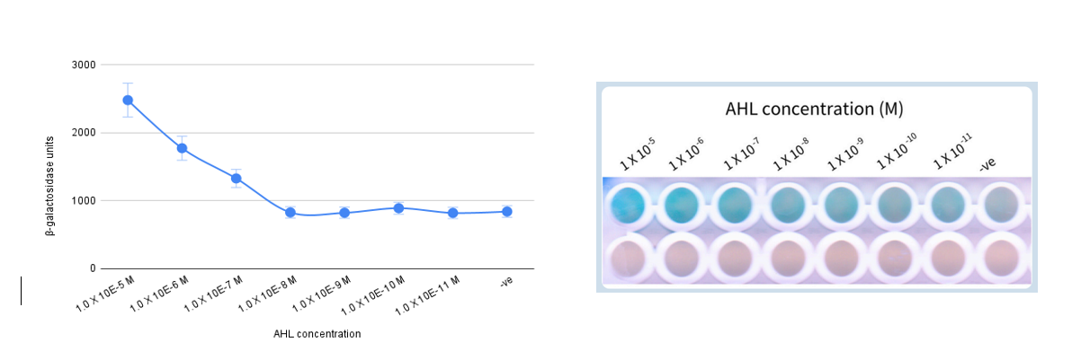 The biosensor was induced in AHL at 1.0 x 10-5 M to 1.0 x 10-11 M for 2 hr, and the blue luminescence production rate is quantified as β-galactosidase activity. The biosensor without AHL induction was used as the negative control. The results are the means of triplicate experiments; error bars indicate the standard deviations. Results were taken 30 minutes after X-gal induction.
