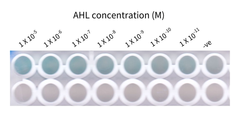 We developed a hydrogel-based assay with the whole-cell biosensor immobilized in the alginate hydrogel. To test the sensitivity of the hydrogel-based assay to detect AHL molecule, the biosensor was induced in different concentration of AHL.