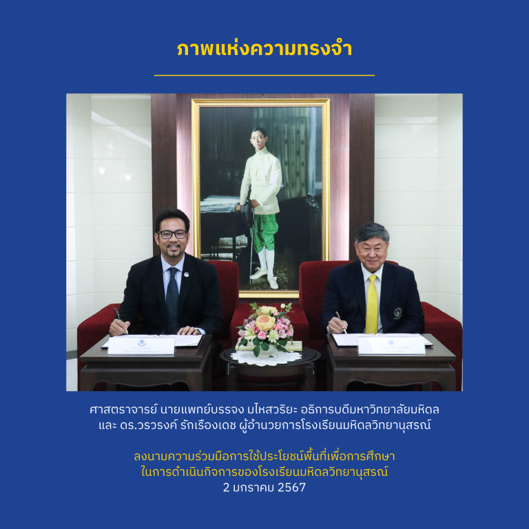 เมื่อวานนี้ (2 มกราคม พ.ศ. 2567) ได้มีการลงนามความร่วมมือฉบับใหม่ ระหว่าง ศาสตราจารย์ นายแพทย์บรรจง มไหสวริยะ อธิการบดีมหาวิทยาลัยมหิดล และ ดร.วรวรงค์ รักเรืองเดช ผู้อำนวยการโรงเรียนมหิดลวิทยานุสรณ์ ในการใช้ประโยชน์พื้นที่เพื่อการศึกษา ระหว่างมหาวิทยาลัยมหิดล กับโรงเรียนมหิดลวิทยานุสรณ์ เพื่อให้โรงเรียนมหิดลวิทยานุสรณ์บริหารจัดการและดำเนินการจัดการเรียนการสอนในระดับมัธยมศึกษาที่มุ่งเน้นความเป็นเลิศทางด้านวิทยาศาสตร์และคณิตศาสตร์สำหรับนักเรียนที่มีศักยภาพสูงทางวิทยาศาสตร์และคณิตศาสตร์ ตามพระราชกฤษฎีการจัดตั้งโรงเรียนมหิดลวิทยานุสรณ์ เป็นระยะเวลา 30 ปี โดยมี อาจารย์จตุภรณ์ สวัสดิ์รักษา รองผู้อำนวยการโรงเรียนมหิดลวิทยานุสรณ์ คุณปัญญา ธำรงธีระกุล ผู้อำนวยการศูนย์บริหารสินทรัพย์ มหาวิทยาลัยมหิดล คุณอวยชัย อิสรวิริยะสกุล ผู้อำนวยการกองกฎหมาย มหาวิทยาลัยมหิดล และบุคลากรของทั้งสองหน่วยงาน ร่วมเป็นสักขีพยาน ณ สำนักงานอธิการบดี มหาวิทยาลัยมหิดล ศาลายา