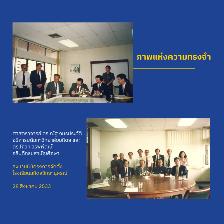 หากย้อนกลับไปเมื่อ 28 สิงหาคม พ.ศ. 2533 วันนั้นเป็นวันที่ ศาสตราจารย์ ดร.ณัฐ ภมรประวัติ อธิการบดีมหาวิทยาลัยมหิดลและ ดร.โกวิท วรพิพัฒน์ อธิบดีกรมสามัญศึกษา (ผู้ซึ่งดำรงตำแหน่งในขณะนั้น) ได้ร่วมลงนามในโครงการจัดตั้งโรงเรียนมัธยมศึกษาที่เน้นการเรียนการสอนทางด้านวิชาคณิตศาสตร์ วิทยาศาสตร์ และคอมพิวเตอร์โดยเฉพาะ บนพื้นที่ของมหาวิทยาลัยมหิดล ตำบลศาลายา กิ่งอำเภอพุทธมณฑล จังหวัดนครปฐม เป็นระยะเวลา 30 ปี