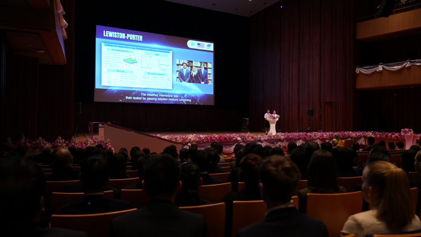 พร้อมกันนี้ ทรงรับฟังการนำเสนอผลงานของนักเรียนโรงเรียนมหิดลวิทยานุสรณ์ เรื่อง “แนวคิดใหม่ในการออกแบบยาเปบไทด์ตัวใหม่สำหรับการรักษาโรคมะเร็งแบบมุ่งเป้าจากลําดับกรดอะมิโนที่กําหนดความจําเพาะของแอนติบอดี้ต่อแอนติเจน (The Breakthrough Idea in Designing a Novel Peptide Drug for Cancer from Specific Amino Acid Sequences that determine the Specificity of Antibody and Antigen)” นำเสนอโดย นายพีรดนย์ แซ่จึง นายชัยดิฐ ลิ่มกาญจนาโชติ นางสาววาราดา จงจิระวงศา และทอดพระเนตรการแสดง The 1st MWIT Symphony Orchestra ในบทเพลง “คีตกาลแห่งศรีตรัง” และ บทเพลง “ยามเย็น” ก่อนเสด็จพระราชดำเนินกลับ