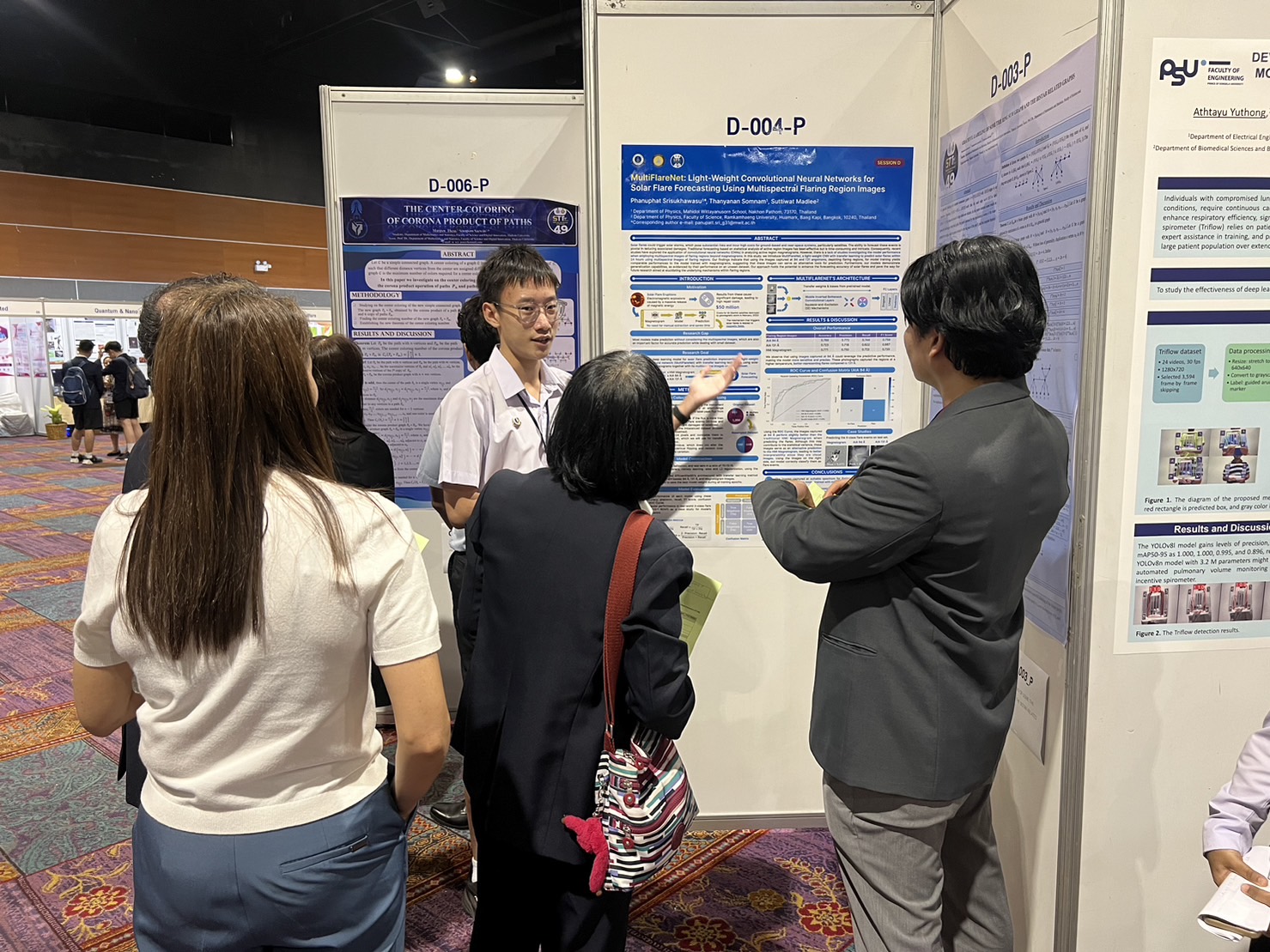 • ผลงานเรื่อง “MultiFlareNet: Enhancing light-weight convolutional neural networks for solar flare forecasting with multispectral active region images” นำเสนอโดย นายภาณุพัฒน์ ศรีสุขวสุ นักเรียนชั้น ม.6/1 มี ดร.ธัญนันท์ สมนาม ครูสาขาวิชาฟิสิกส์ เป็นที่ปรึกษาโครงงาน และ ดร.สุทธิวัฒน์ หมาดหลี จาก ภาควิชาฟิสิกส์ คณะวิทยาศาสตร์ มหาวิทยาลัยรามคำแหง เป็นที่ปรึกษาภายนอก