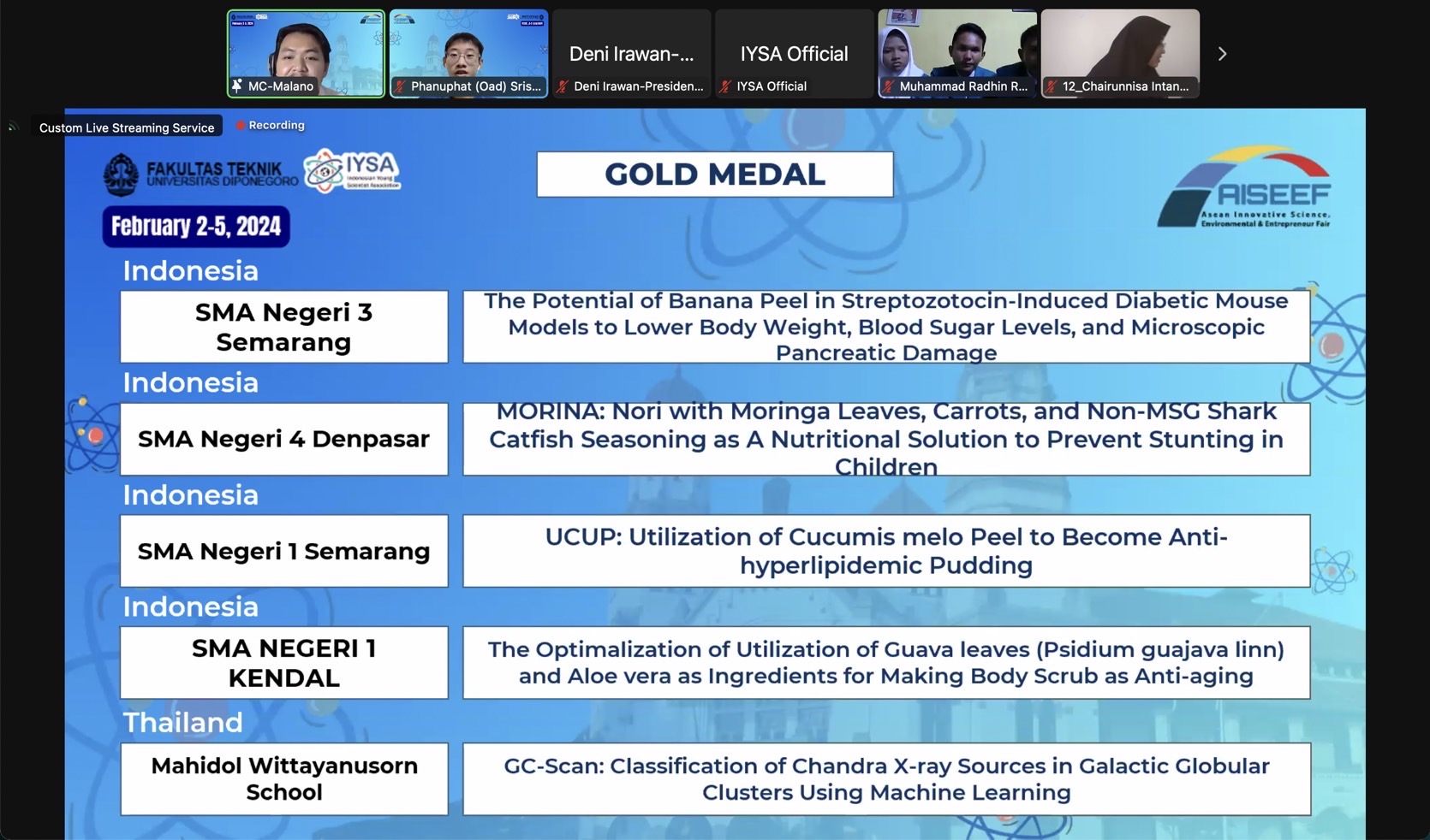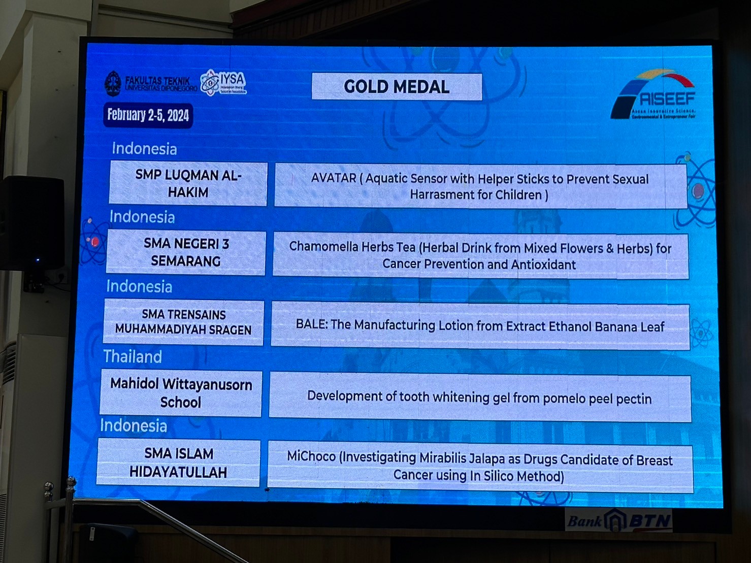 งาน ASEAN Innovative Science Environmental and Entrepreneur Fair (AISEEF) เป็นเวทีการแข่งขันโครงงานวิทยาศาสตร์และนวัตกรรมระดับนานาชาติ จัดโดย Indonesian Young Scientist Association (IYSA) ร่วมกับ Faculty of Engineering, Diponegoro University สาธารณรัฐอินโดนีเซีย โดยมีวัตถุประสงค์เพื่อให้นักเรียนระดับชั้นประถมศึกษา มัธยมศึกษา และนักศึกษามหาวิทยาลัยจากทั่วโลก ได้มีโอกาสนำเสนอผลงานวิจัยและโครงงานเพื่อส่งเสริมความคิดสร้างสรรค์และนวัตกรรมด้านวิทยาศาสตร์และธุรกิจ ทั้งนี้ งาน AISEEF 2024 ได้มีการจัดขึ้นทั้งรูปแบบออนไลน์และออนไซต์ ระหว่างวันที่ 1 – 6 กุมภาพันธ์ พ.ศ. 2567 ณ Diponegoro University เมืองเซอมารัง สาธารณรัฐอินโดนีเซีย โดยมี โครงงานที่เข้าร่วมงานรูปแบบออนไลน์ จำนวน 293 โครงงาน จาก 15 ประเทศ ได้แก่ สาธารณรัฐอินโดนีเซีย สหพันธรัฐมาเลเซีย สาธารณรัฐฟิลิปปินส์ ประเทศไทย ราชอาณาจักรโรมาเนีย สาธารณรัฐคาซัคสถาน สาธารณรัฐโปรตุเกส สาธารณรัฐมาซิโดเนียเหนือ สาธารณรัฐสิงคโปร์ สหรัฐอเมริกา สหรัฐอาหรับเอมิเรตส์ สาธารณรัฐสังคมนิยมเวียดนาม สาธารณรัฐเกาหลี เขตบริหารพิเศษฮ่องกงแห่งสาธารณรัฐประชาชนจีน และ สาธารณรัฐทูร์เคีย ส่วนโครงงานที่เข้าร่วมงานรูปแบบออนไซต์ เป็นโครงงานจากสาธารณรัฐอินโดนีเซียและประเทศไทย 152 โครงงาน