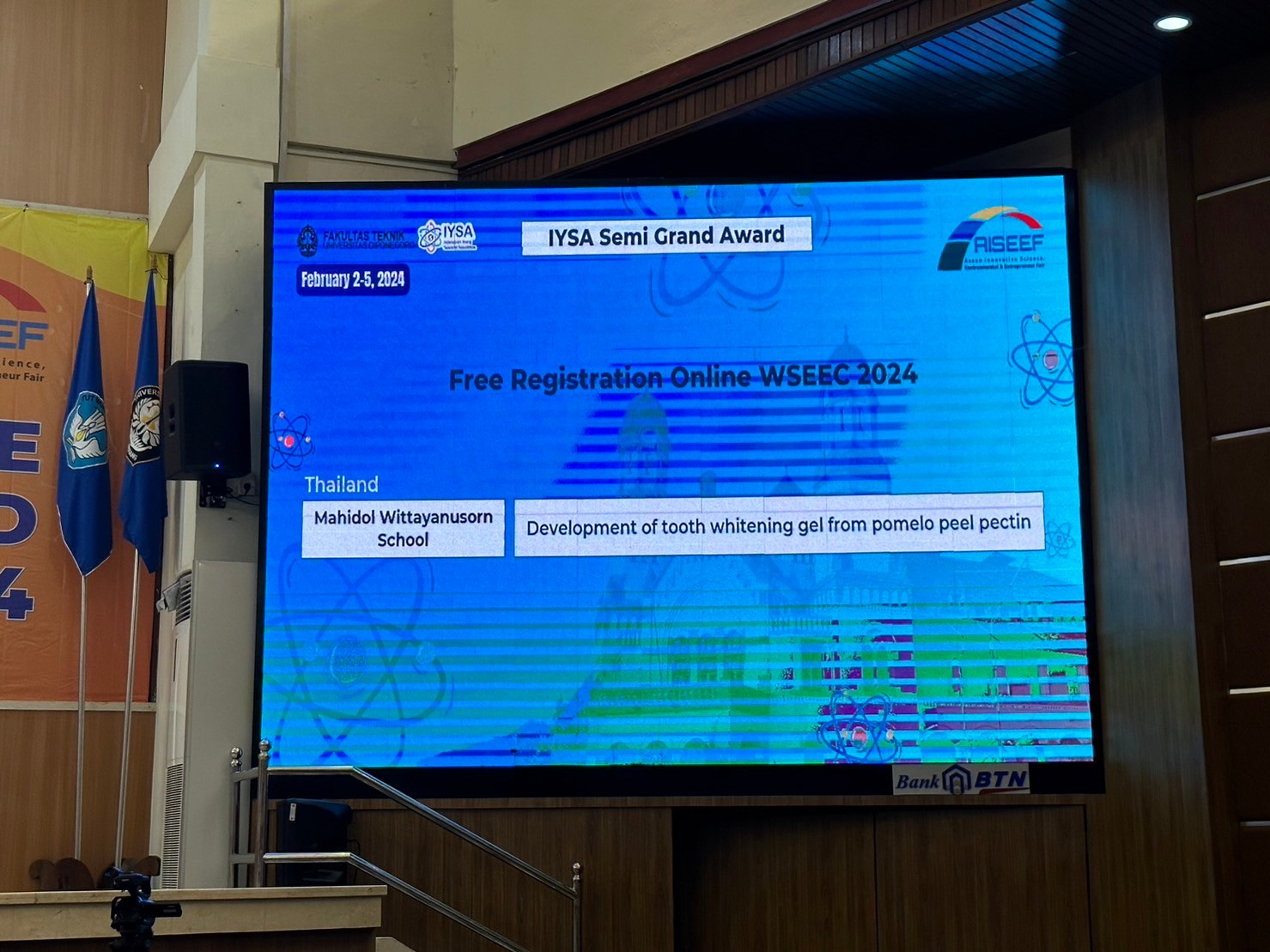- รางวัล IYSA Semi Grand Award โดยได้รับสิทธิ์เข้าร่วมงาน the 4th World Science, Environment and Engineering Competition (WSEEC 2024) ในรูปแบบออนไลน์โดยไม่มีค่าใช้จ่าย โดยงานจะจัดขึ้นระหว่างวันที่ 12-18 พฤษภาคม พ.ศ. 2567 ณ สาธารณรัฐอินโดนีเซีย