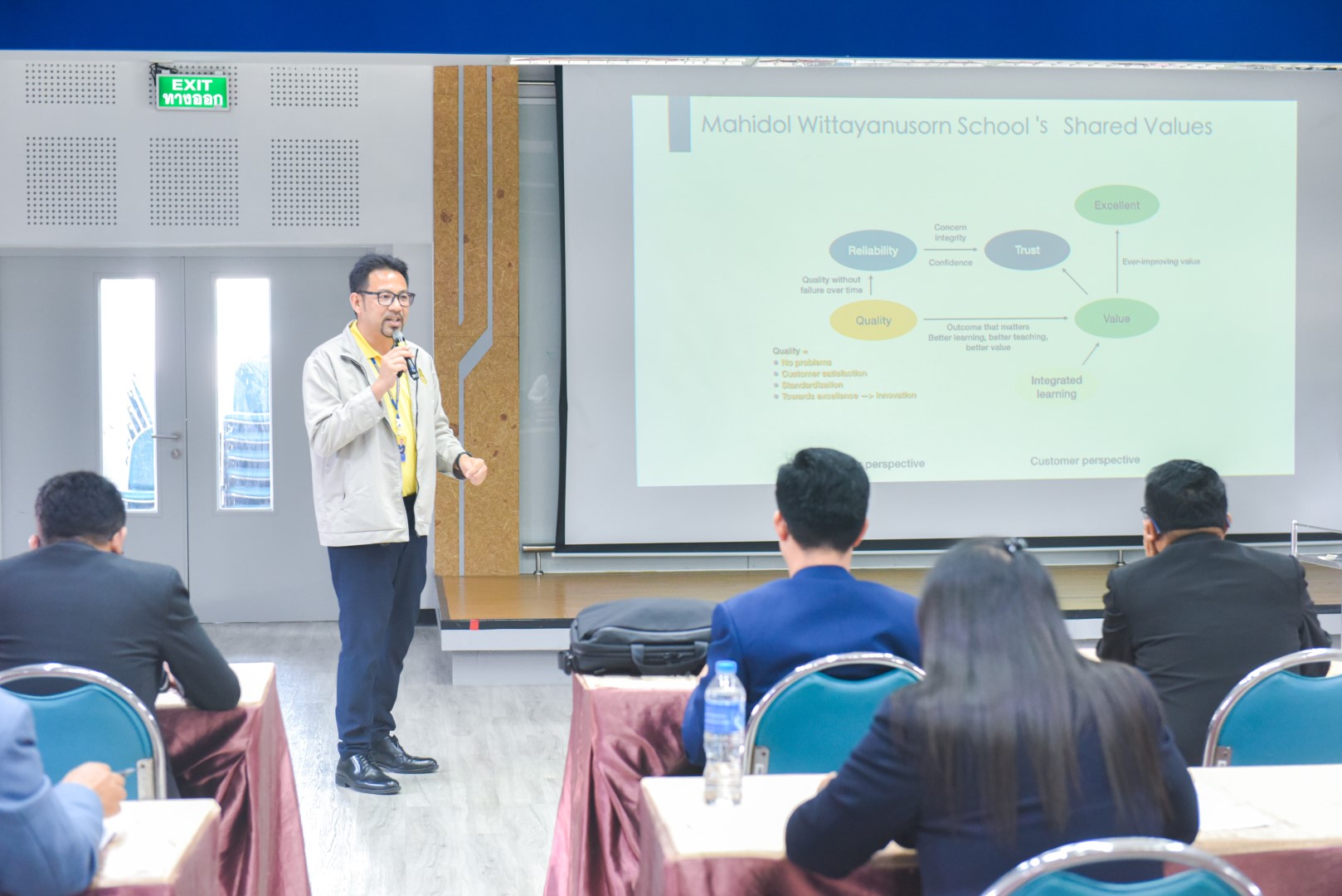 ช่วงเช้าของวันแรกในการอบรม อาจารย์จตุภรณ์ สวัสดิ์รักษา รองผู้อำนวยการโรงเรียนมหิดลวิทยานุสรณ์ ได้แลกเปลี่ยนมุมมองในการดำเนินงานของโรงเรียนและกระบวนการพัฒนานักเรียนในด้านวิชาการ ร่วมกับคณะผู้บริหารและครูจากกลุ่มโรงเรียนวิทยาศาสตร์จุฬาภรณราชวิทยาลัย ที่จะต้องมองบริบทในมิติต่าง ๆ ประกอบกัน ทั้งความรู้ (knowledge) ทักษะ (Skills) และทัศนคติและค่านิยม (Attitude and Values)  จากนั้น หัวหน้าสาขาวิชา/ฝ่าย ของโรงเรียนมหิดลวิทยานุสรณ์ได้นำเสนอตัวอย่างการบริหารงานและผลการดำเนินงานของสาขา/ฝ่าย เช่น การวางแผนยุทธศาสตร์ที่มีการหารือร่วมกันอันจะนำไปสู่เป้าหมาย (ตัวชี้วัด) บทบาทของหัวหน้า การส่งเสริมงานวิจัยของนักเรียนและครู การพัฒนานักเรียนตามฐานสมรรถนะ การเปิดโอกาสให้นักเรียนเลือกเรียนตามความสนใจและจัดกิจกรรมส่งเสริมศักยภาพในรูปแบบต่าง ๆ ที่มีการลงพื้นที่และลงมือปฏิบัติ เป็นต้น ทั้งนี้ เพื่อเป็นแนวทางให้ผู้บริหารและครูที่เข้าร่วมอบรมนำไปปรับประยุกต์ใช้