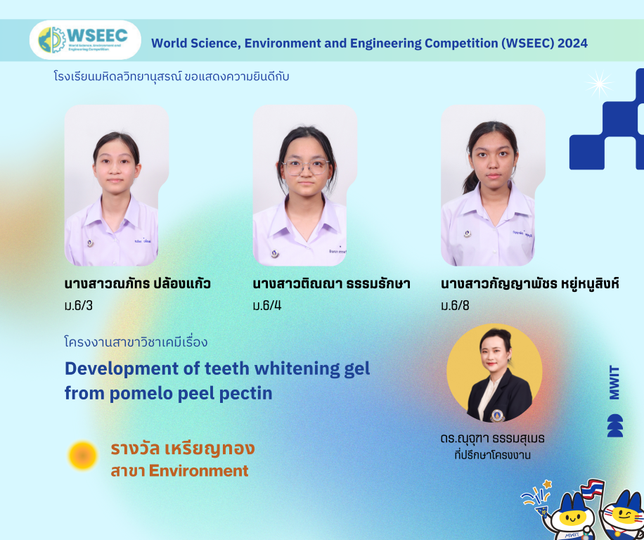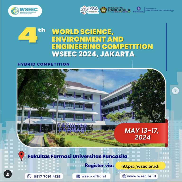 the 4th World Science, Environment and Engineering Competition (WSEEC) 2024 เป็นเวทีการแข่งขันโครงงานวิทยาศาสตร์และนวัตกรรมระดับนานาชาติ จัดโดย Indonesian Young Scientist Association (IYSA) ร่วมกับ Faculty of Pharmacy and Department of Food Science and Technology, Institut Pertanian Bogor (IPB) Universitas Pancasila กรุงจาการ์ตา สาธารณรัฐอินโดนีเซีย โดยมีวัตถุประสงค์เพื่อให้นักเรียนระดับชั้นประถมศึกษา มัธยมศึกษา และนักศึกษามหาวิทยาลัยทั่วโลก ได้มีโอกาสนำเสนอผลงานวิจัยและโครงงานด้านวิทยาศาสตร์ สิ่งแวดล้อม และวิศวกรรม เพื่อพัฒนาทักษะการทำวิจัยและความคิดสร้างสรรค์ในการสร้างผลงานนวัตกรรม