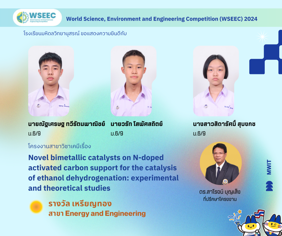 - โครงงานสาขาวิชาเคมีเรื่อง “Novel bimetallic catalysts on N-doped activated carbon support for the catalysis of ethanol dehydrogenation: experimental and theoretical studies” ผลงานของ นายณัฐเศรษฐ ทวีรัตนพาณิชย์ นักเรียนชั้น ม.6/9 นายวรัท โสพัศสถิตย์ นักเรียนชั้น ม.6/9 และ นางสาวสิดารัศมิ์ สุบงกช นักเรียนชั้น ม.6/9 โดยมี ดร.สาโรจน์ บุญเส็ง ครูสาขาวิชาเคมี เป็นที่ปรึกษาโครงงาน