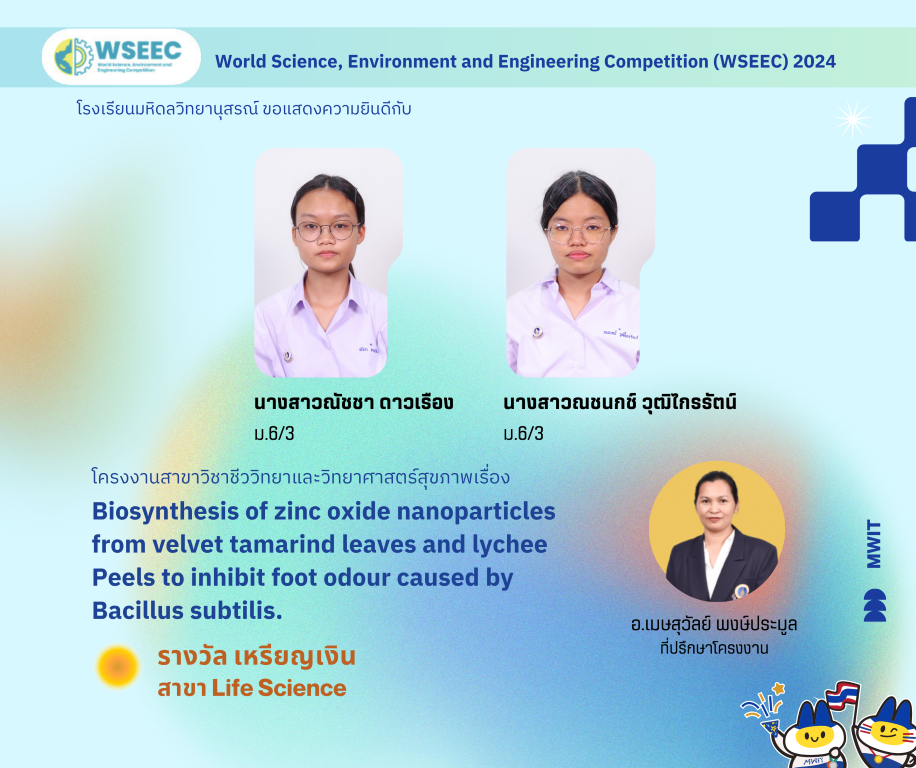 - โครงงานสาขาวิชาชีววิทยาและวิทยาศาสตร์สุขภาพเรื่อง “Biosynthesis of zinc oxide nanoparticles from velvet tamarind leaves and lychee Peels to inhibit foot odour caused by Bacillus subtilis.” ผลงานของ นางสาวณัชชา ดาวเรือง นักเรียนชั้น ม.6/3 และ นางสาวณชนกช์ วุฒิไกรรัตน์ นักเรียนชั้น ม.6/3 โดยมี อาจารย์เมษสุวัลย์ พงษ์ประมูล ครูสาขาวิชาชีววิทยาและวิทยาศาสตร์สุขภาพ เป็นที่ปรึกษาโครงงาน