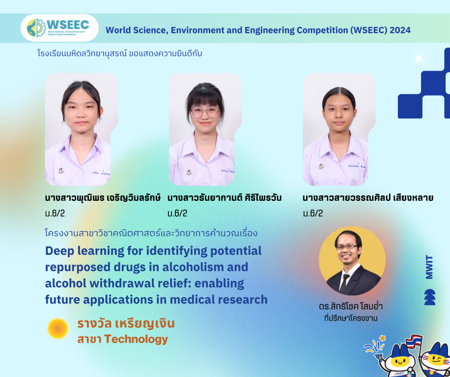 - โครงงานสาขาวิชาคณิตศาสตร์และวิทยาการคำนวณเรื่อง “Deep learning for identifying potential repurposed drugs in alcoholism and alcohol withdrawal relief: enabling future applications in medical research.” ผลงานของ นางสาวธันยากานต์ ศิริไพรวัน นักเรียนชั้น ม.6/2 นางสาวพุฒิพร เจริญวิมลรักษ์ นักเรียนชั้น ม.6/2 และ นางสาวสายวรรณศิลป เสียงหลาย นักเรียนชั้น ม.6/2 โดยมี ดร.สิทธิโชค โสมอ่ำ ครูสาขาวิชาคณิตศาสตร์และวิทยาการคำนวณ เป็นที่ปรึกษาโครงงาน