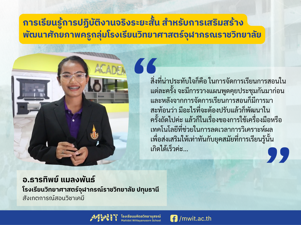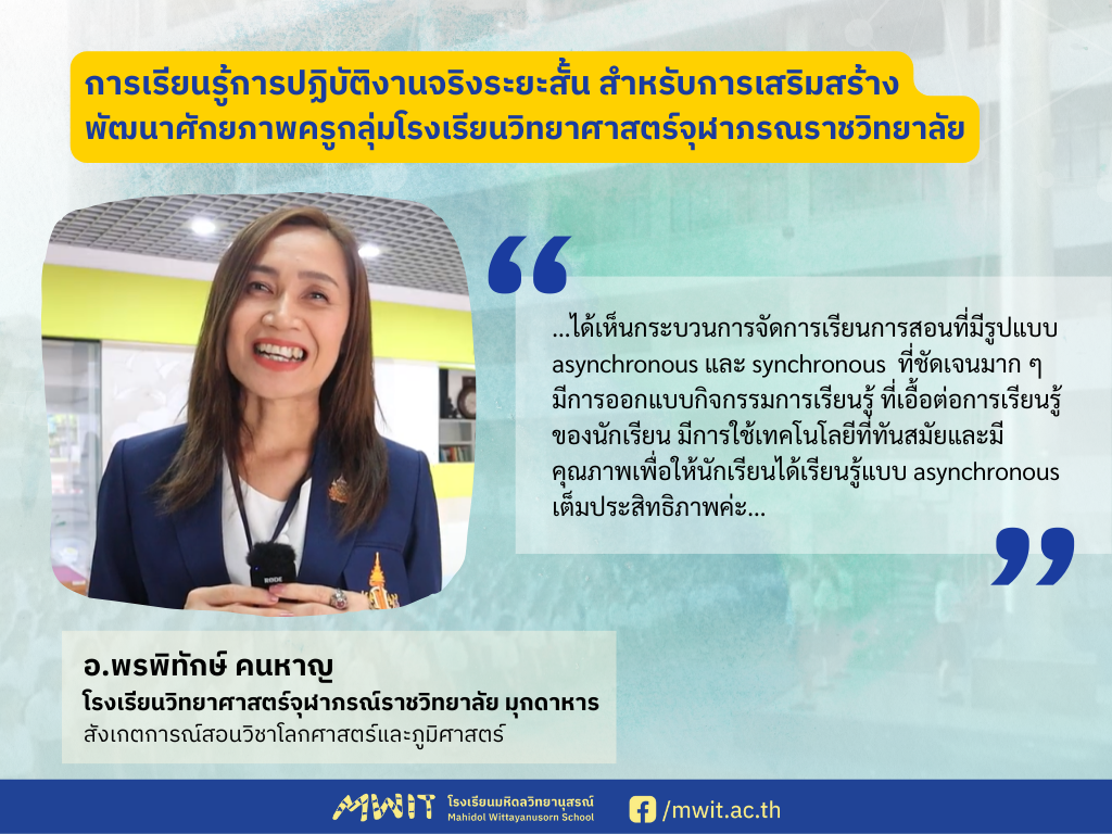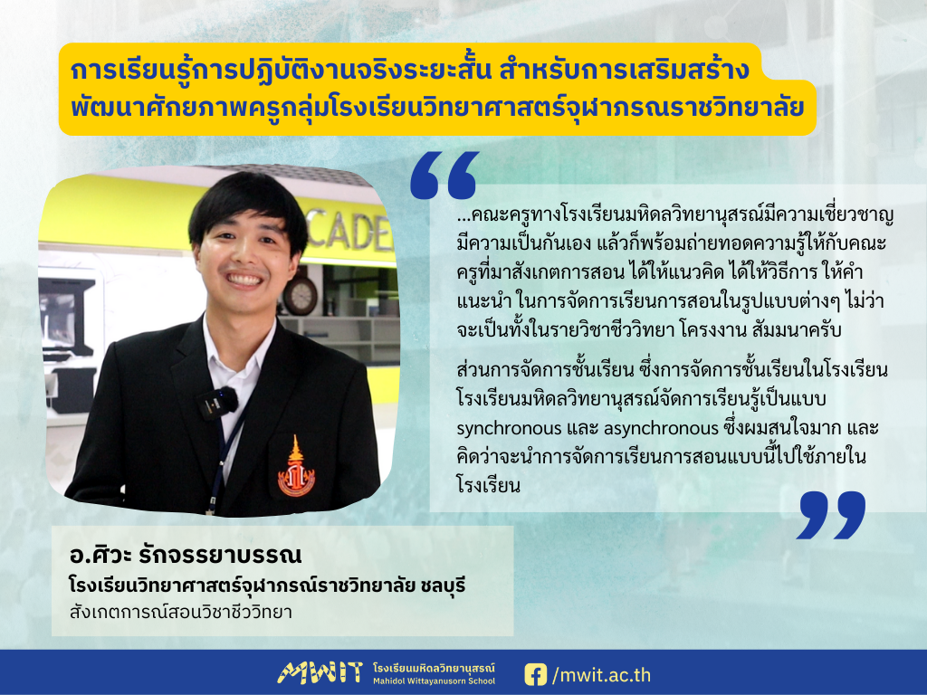 ความประทับใจของคุณครูจากกลุ่มโรงเรียนวิทยาศาสตร์จุฬาภรณราชวิทยาลัย กลุ่มที่ 3 ที่เดินทางมาเรียนรู้การปฏิบัติงานจริงระยะสั้น ระหว่างวันที่ 10-21 มิถุนายน พ.ศ. 2567 ได้ถูกส่งต่อมายังคณะผู้บริหารและคุณครูของโรงเรียนมหิดลวิทยานุสรณ์ ซึ่งคุณครูโรงเรียนวิทยาศาสตร์จุฬาภรณราชวิทยาลัย จากทั้ง 5 โรงเรียนในรอบนี้ ที่เดินทางกันมาจากจังหวัดชลบุรี เพชรบุรี ปทุมธานี มุกดาหาร บุรีรัมย์ ต่างบอกเล่าถึงสิ่งที่ได้เรียนรู้และความประทับใจจากการเข้าร่วมกิจกรรมในช่วง 2 สัปดาห์ ที่ผ่านมา
