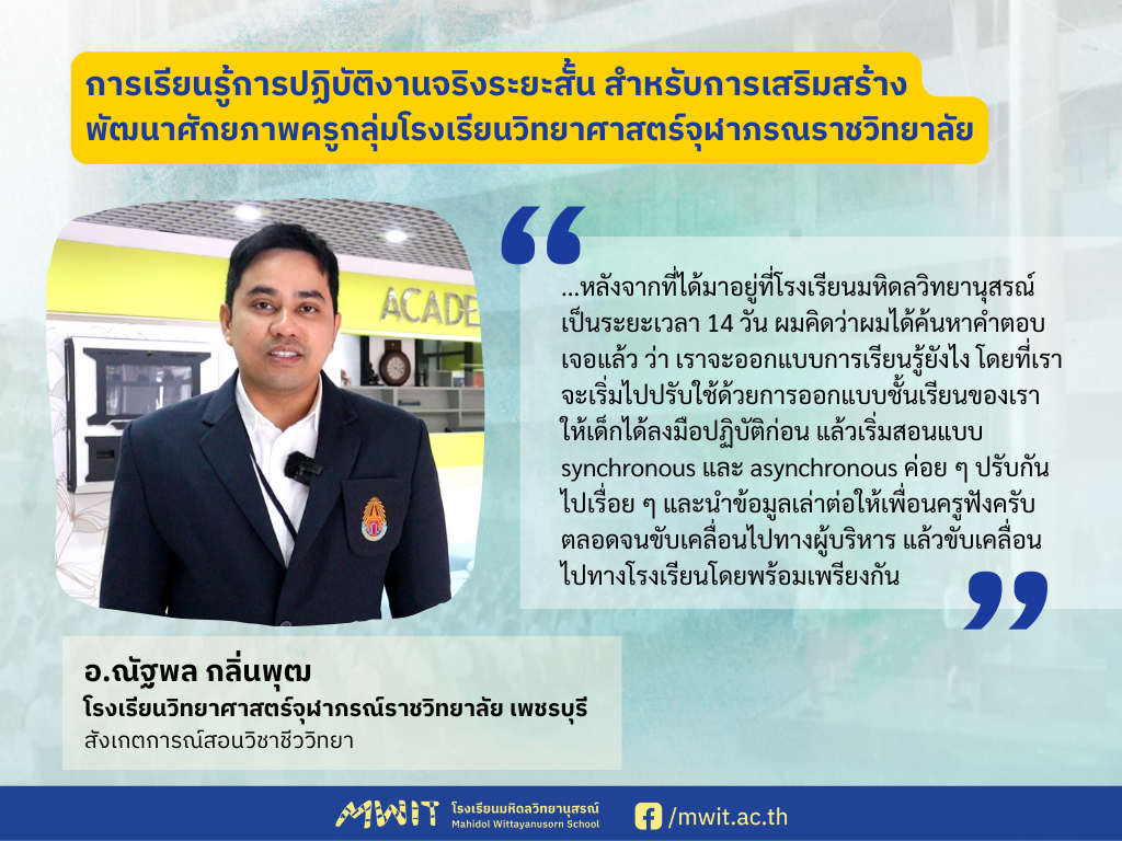 ในฐานะที่เราเป็นครู และหลายคนเคยตั้งคำถามครับว่า ในยุคที่ความรู้ข้อมูลอยู่ในทั่วไป นักเรียนค้นหาได้ด้วยตัวเอง เราจะออกแบบการจัดการเรียนการสอนยังไง หลังจากที่เราได้มาอยู่ที่โรงเรียนมหิดลวิทยานุสรณ์เป็นระยะเวลา 14 วัน ผมคิดว่าผมได้ค้นหาคำตอบนั้นเจอแล้ว ว่าเราจะออกแบบการเรียนรู้ยังไง โดยที่เราจะเริ่มไปปรับใช้ด้วยการออกแบบชั้นเรียนของเรา ให้เด็กได้ลงมือปฏิบัติก่อน แล้วเริ่มสอนแบบ synchronous และ asynchronous ค่อย ๆ ปรับกันไปเรื่อย ๆ และนำข้อมูลเล่าต่อให้เพื่อนครูฟังครับ ตลอดจนขับเคลื่อนไปอย่างผู้บริหาร แล้วก็ขับเคลื่อนไปทางโรงเรียนโดยพร้อมเพรียงกัน