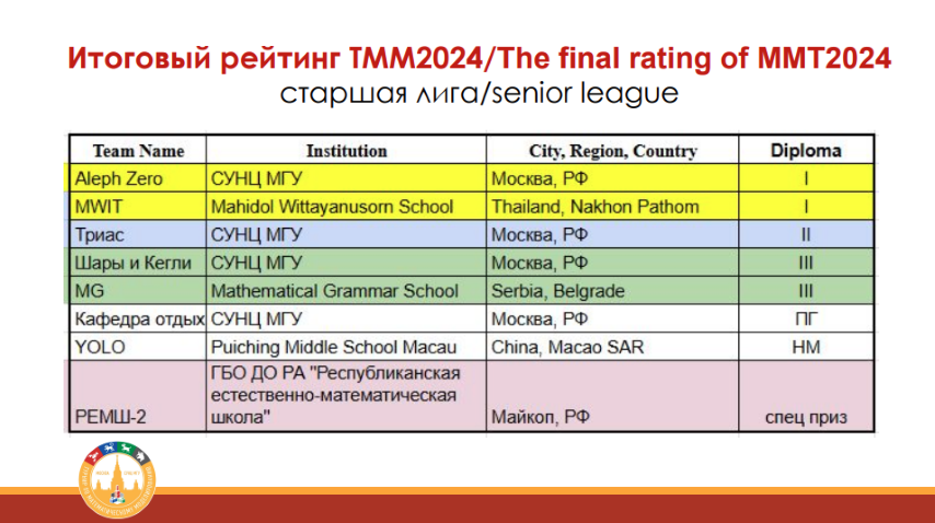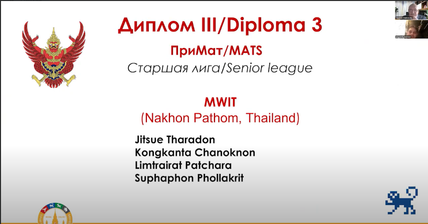 การแข่งขัน The 7th International Mathematical Modelling Tournament 2024 จัดโดย Advanced Education and Science Center of Moscow State University (Kolmogorov School) สหพันธรัฐรัสเซีย เป็นการแข่งขันของนักเรียนผู้มีความสามารถพิเศษด้านคณิตศาสตร์จากโรงเรียนต่าง ๆ ทั่วประเทศสหพันธรัฐรัสเซีย รวมถึงจากโรงเรียนในต่างประเทศ รวม 5 ประเทศ จำนวน 18 ทีม
