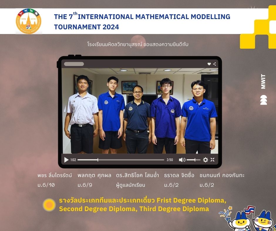 นักเรียนโรงเรียนมหิดลวิทยานุสรณ์ได้รับรางวัล Frist Degree Diploma, Second Degree Diploma, Third Degree Diploma จากการแข่งขัน The 7th International Mathematical Modelling Tournament 2024 (MMT2024) ซึ่งจัดขึ้นในรูปแบบออนไลน์ ระหว่างวันที่ 28 ตุลาคม – 3 พฤศจิกายน พ.ศ. 2567