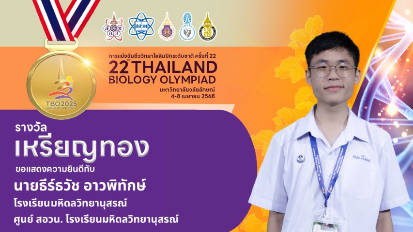 ศูนย์โอลิมปิกวิชาการ สอวน. โรงเรียนมหิดลวิทยานุสรณ์ วิชาชีววิทยา นำโดย ดร.โอภาส พระเทพ ครูสาขาชีววิทยาและวิทยาศาสตร์สุขภาพ (หัวหน้าทีม) พร้อมด้วย ดร.พุธิตา จิรานันท์สกุล ครูสาขาชีววิทยาและวิทยาศาสตร์สุขภาพ (รองหัวหน้าทีม) และ อาจารย์อาจรีย์ ธิราช จากโรงเรียนกำเนิดวิทย์ (ผู้ช่วยหัวหน้าทีม) ได้นำนักเรียนผู้แทนศูนย์ และนักเรียนที่ได้รับสิทธิ์จาก สสวท. รวมทั้งสิ้น 8 คน เข้าร่วมการแข่งขันชีววิทยาโอลิมปิกระดับชาติ ครั้งที่ 22 (The 22nd Thailand Biology Olympiad) ซึ่งจัดโดย สำนักวิชาวิทยาศาสตร์ มหาวิทยาลัยวลัยลักษณ์ ร่วมกับ มูลนิธิส่งเสริมโอลิมปิกวิชาการและพัฒนามาตรฐานวิทยาศาสตร์ศึกษา ในพระอุปถัมภ์สมเด็จพระเจ้าพี่นางเธอ เจ้าฟ้ากัลยาณิวัฒนา กรมหลวงนราธิวาสราชนครินทร์ (สอวน.) ซึ่งนักเรียนสามารถแสดงศักยภาพได้อย่างโดดเด่น คว้ารางวัลมาได้ดังนี้