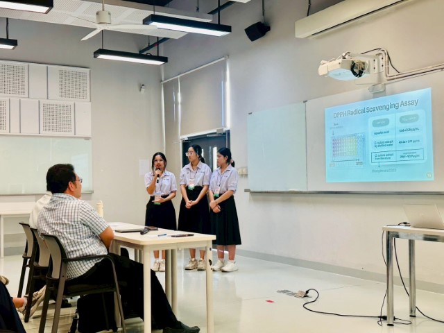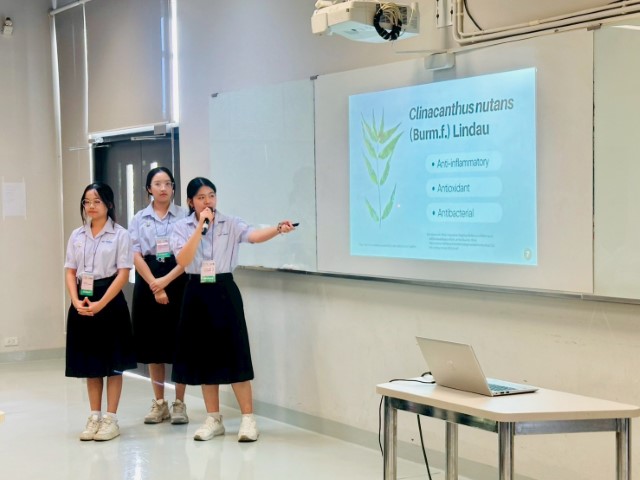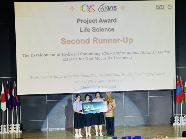 สำหรับโครงงานของนักเรียนโรงเรียนมหิดลวิทยานุสรณ์นั้น เป็นโครงงานในสาขาวิชาเคมี หัวข้อ “The development of hydrogel containing Clinacanthus nutans (Burm.f.) Lindau extracts for oral mucositis treatment” ผลงานของ นางสาวนันทภัค หงษ์พานิช นักเรียนชั้น ม.5/8 นางสาวปุญญ์ จันทรังสิกุล นักเรียนชั้น ม.5/7 และ นางสาววนัชพร สุทธิพิริยะหทัย นักเรียนชั้น ม.5/2 มี ดร.ณุจุฑา ธรรมสุเมธ ครูสาขาวิชาเคมี และ ผู้ช่วยศาสตราจารย์ ดร.ชิตชไม โอวาทฬารพร สาขาวิชาเภสัชเคมี คณะเภสัชศาสตร์ มหาวิทยาลัยสงขลานครินทร์ เป็นที่ปรึกษาโครงงาน ซึ่งการนำเสนอในงานนี้ ดร.ณุจุฑา ธรรมสุเมธ ได้ดูแลนักเรียนเข้าร่วมกิจกรรมด้วยตนเอง โดยนักเรียนได้รับรางวัลรางวัล Project Award 2nd Runner-Up in Life Sciences จากการนำเสนอ