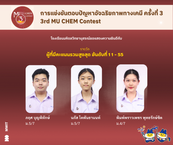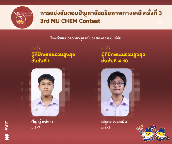 นักเรียนโรงเรียนมหิดลวิทยานุสรณ์คว้ารางวัลผู้ที่มีคะแนนรวมสูงสุดอันดับที่ 1 จากการแข่งขันตอบปัญหาอัจฉริยภาพทางเคมี ครั้งที่ 3 ซึ่งจัดขึ้นเมื่อวันที่ 16 สิงหาคม พ.ศ. 2568 ณ คณะวิทยาศาสตร์ มหาวิทยาลัยมหิดล ศาลายา
