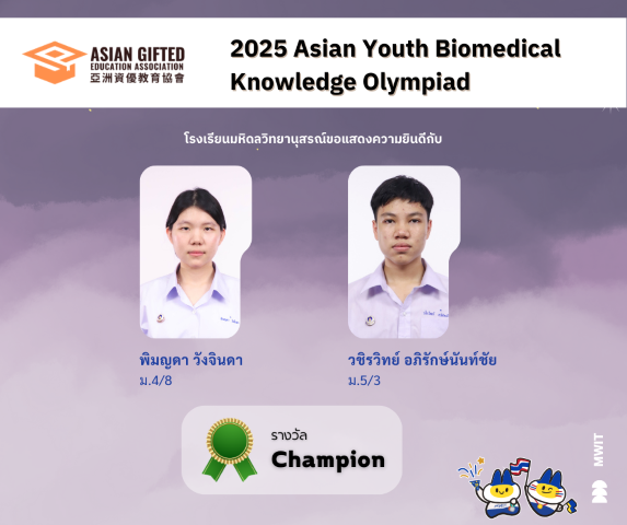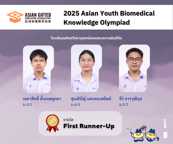 งาน 2025 Asian Youth Biomedical Knowledge Olympiad เป็นเวทีการแข่งขันวิชาการด้านชีวการแพทย์ระดับนานาชาติ จัดโดย Asian Gifted Education (AGEA) ซึ่งเป็นองค์กรด้านการศึกษาระดับนานาชาติ โดยส่งเสริมให้นักเรียนตระหนักถึงความเชื่อมโยงระหว่างชีวการแพทย์กับสุขภาวะชีวิต รวมทั้งได้พัฒนาทักษะการคิดเชิงวิทยาศาสตร์อย่างมีวิจารณญาณ
