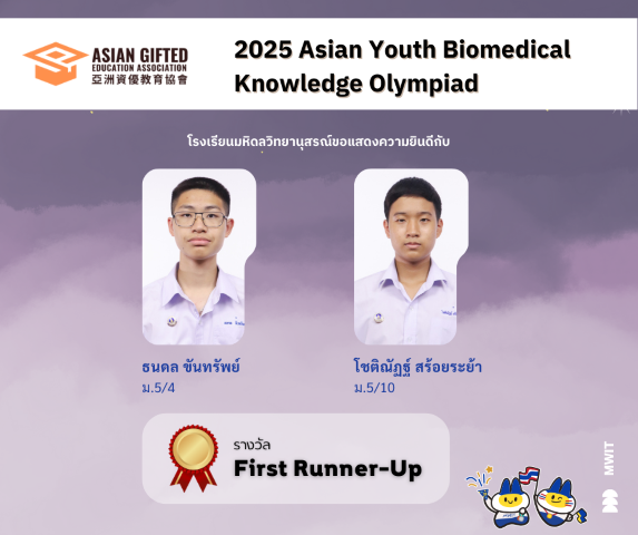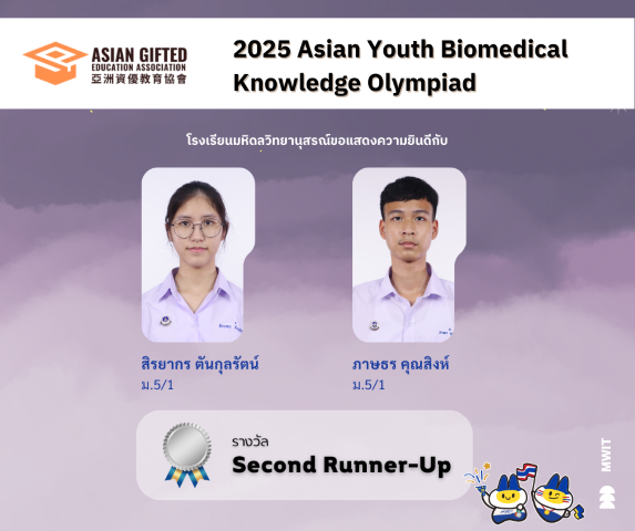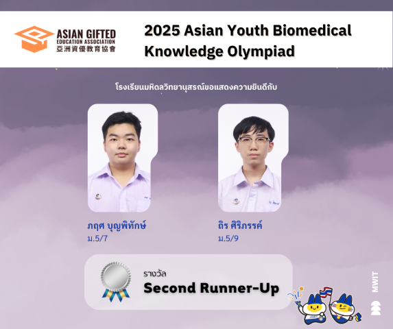 นักเรียนโรงเรียนมหิดลวิทยานุสรณ์รับรางวัลจากการแข่งขันวิชาการระดับนานาชาติรูปแบบออนไลน์ในงาน 2025 Asian Youth Biomedical Knowledge Olympiad จัดโดย Asian Gifted Education เขตบริหารพิเศษฮ่องกงแห่งสาธารณรัฐประชาชนจีน เมื่อวันที่ 16 พฤศจิกายน พ.ศ. 2568