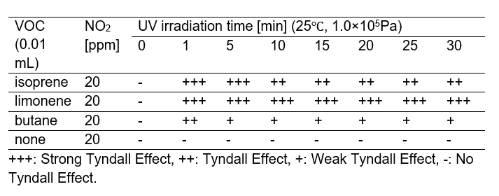 Table 1 shows the results after ultraviolet radiation was used to irradiate nitrogen dioxide diluted by the air and the volatile organic compound (VOC) in the flask. The presence of butane-induced smog was not clearly confirmed. However, there was a Tyndall effect in the flasks that contained isoprene and limonene for more than 30 seconds. The reason for this was that isoprene and limonene have double bonds, but butane has a single bond, making it less reactive.