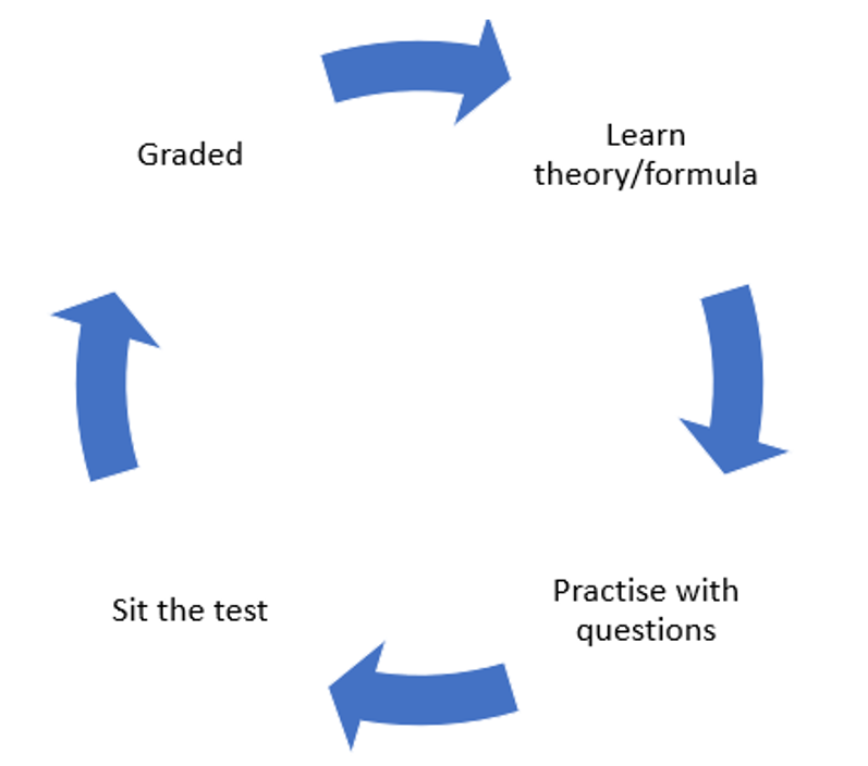 On the other hand, teachers felt it provided a useful measure of students’ current skills and proficiency. I refer to this kind of assessment as the traditional maths learning cycle (see the diagram below).