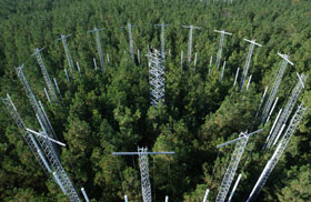 รูปที่ 1 Duke Free Air Carbon Enrichment (FACE) ในมลรัฐ North Carolina ประเทศสหรัฐอเมริกา จาก https://today.duke.edu/2007/08/carbonadd.html
